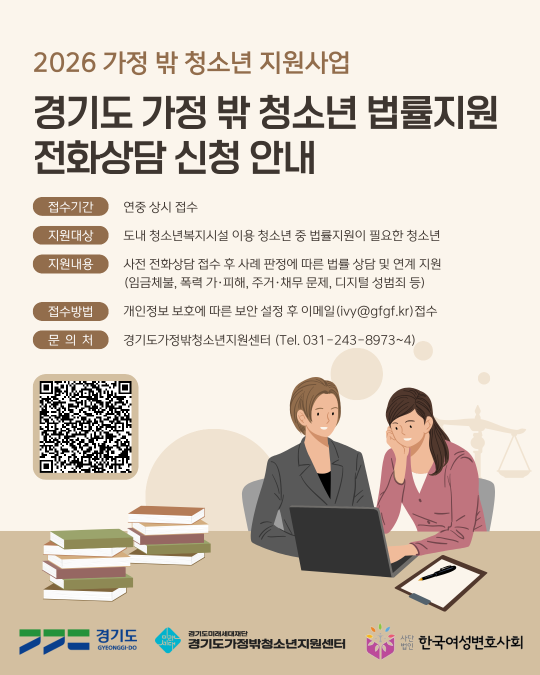 [사업신청] 2026년 경기도 가정 밖 청소년 법률 지원을 위한 전화상담 신청 안내(상시 접수)